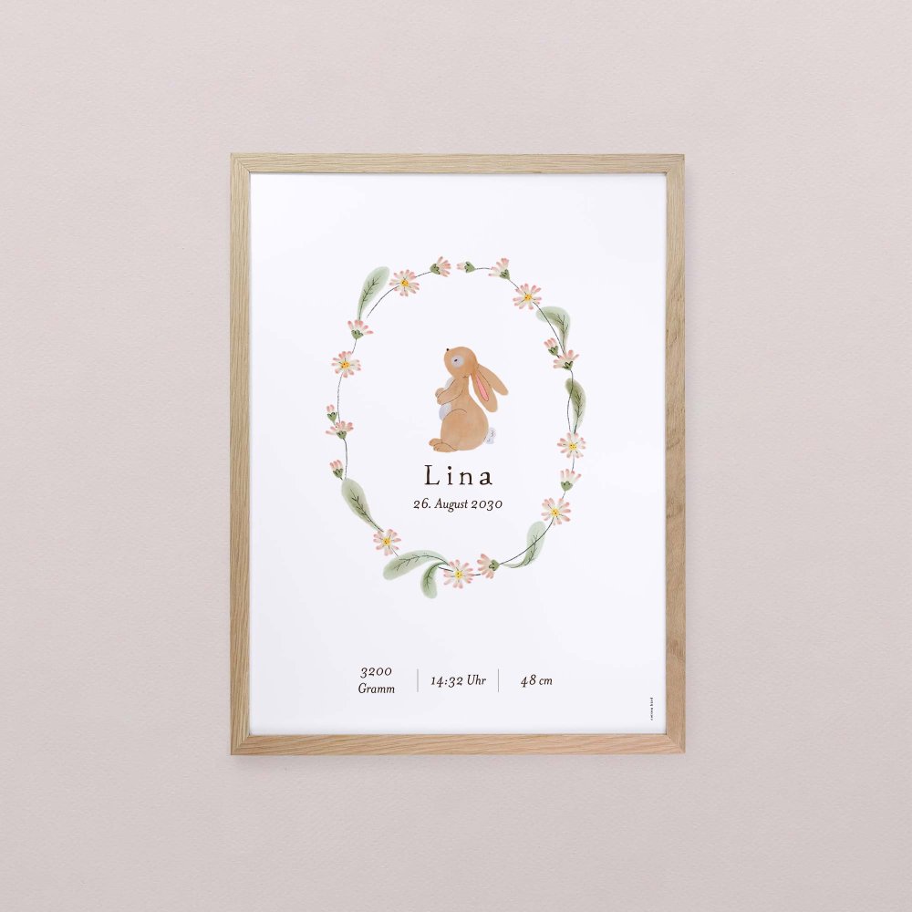 Dekoratives Poster mit Illustration und den wichtigsten Details zur Geburt: Name, Gewicht, Größe des Babys sowie Datum und Uhrzeit!