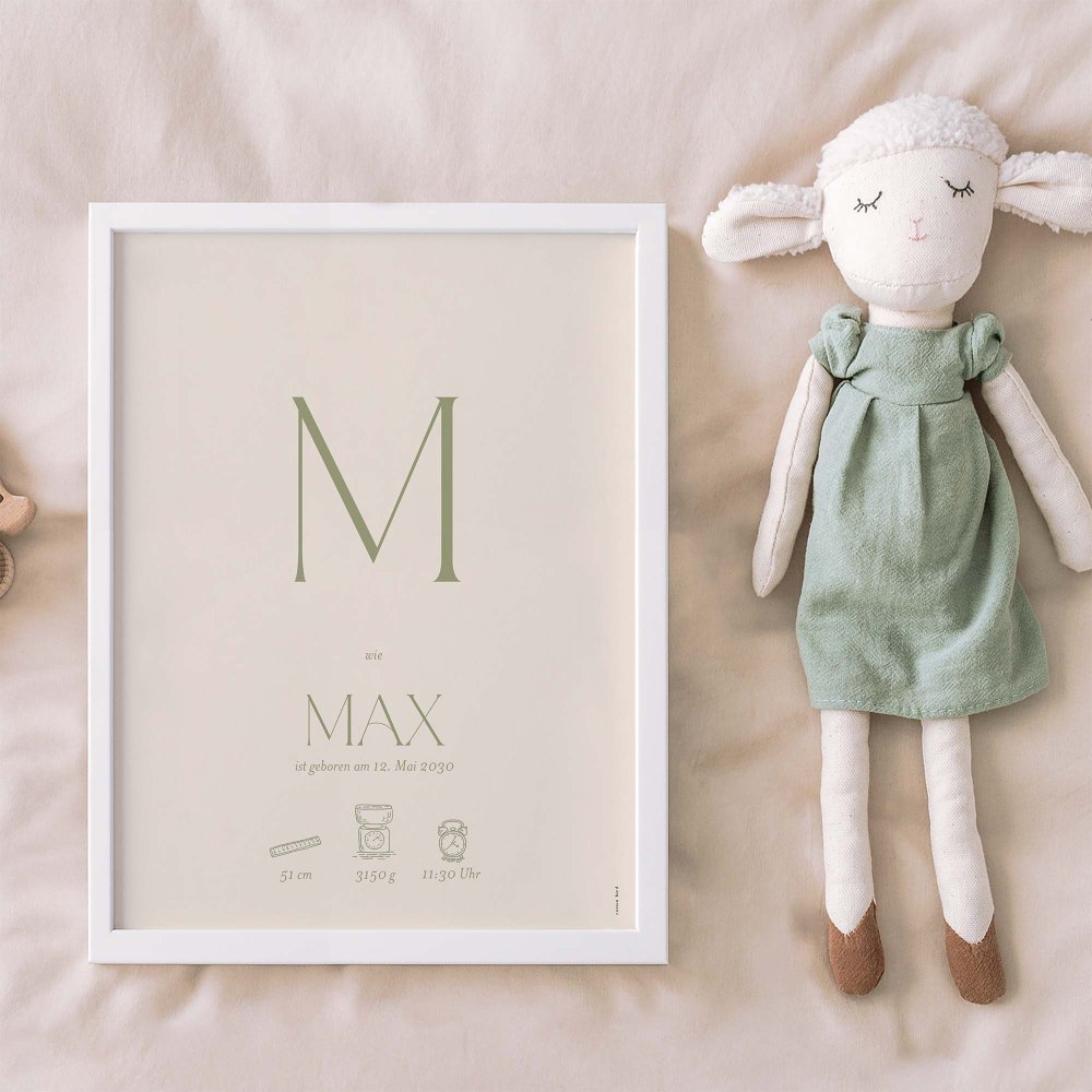 Dekoratives Poster mit Illustration und den wichtigsten Details zur Geburt: Name, Gewicht, Größe des Babys sowie Datum und Uhrzeit!