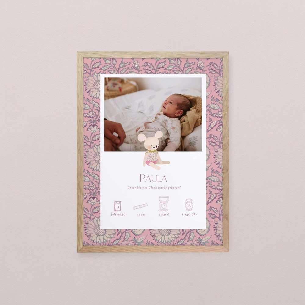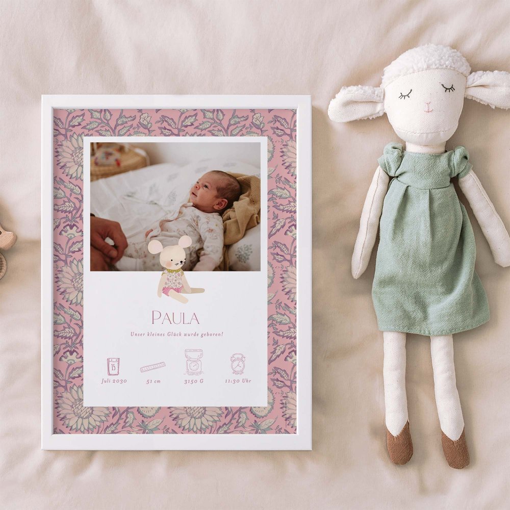 Dekoratives Poster mit Illustration und den wichtigsten Details zur Geburt: Name, Gewicht, Größe des Babys sowie Datum und Uhrzeit!