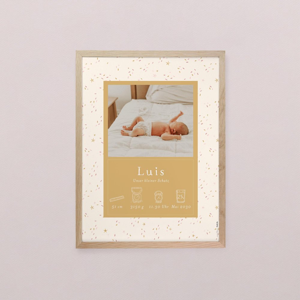 Die Ankunft des Babys ist ein magischer Moment, den wir zelebrieren und für immer in Erinnerung behalten möchten. Gestalten Sie jetzt Ihr eigenes Erinnerungs-Poster mit dem Sie das Kinderzimmer oder die Wohnung dekorieren.