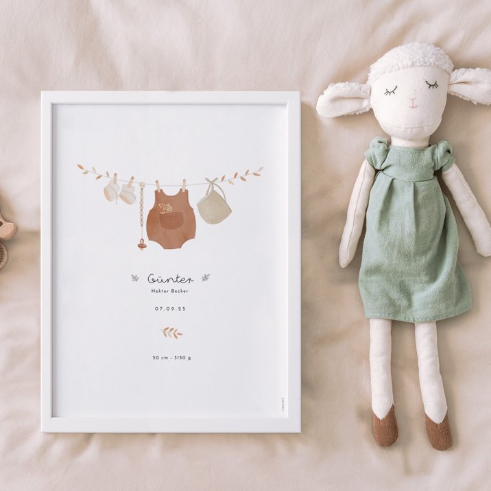 Ihre Geburtskarte als Poster! Dekorieren Sie das Kinderzimmer mit diesem hübschen Poster als Erinnerung an die Geburt Ihres Babys. Gestalten Sie das Design mit dem Namen Kindes, der Größe, dem Gewicht und sowie dem Datum und der Uhrzeit der Geburt.