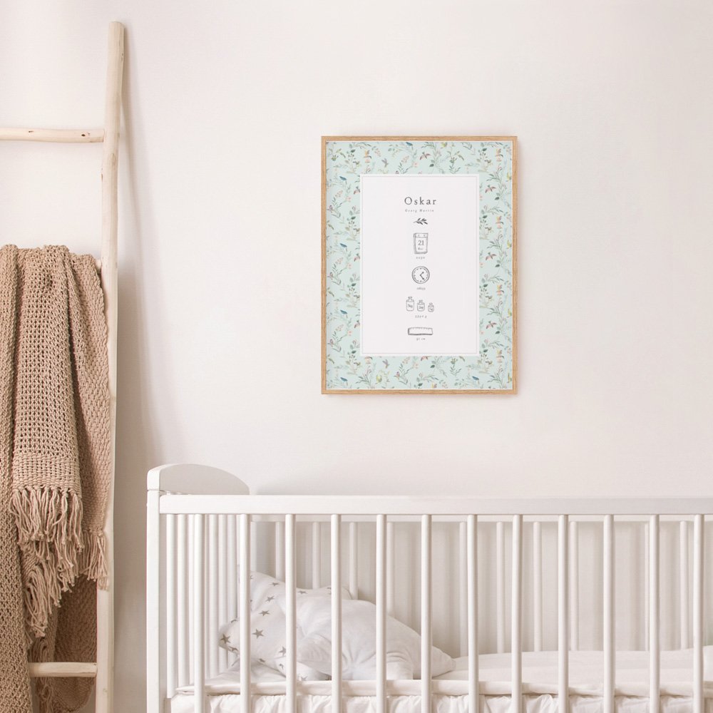 Inspiriert von englischen Blumentapeten bringt das Poster Verdi sanft Farbe ins Kinderzimmer. In der Mitte des Bildes sind außerdem alle wichtigen Details zur Geburt des Babys festgehalten!
