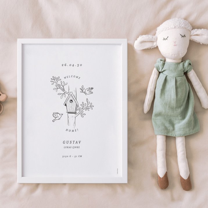 Ihre Geburtskarte als Poster! Dekorieren Sie das Kinderzimmer mit diesem hübschen Poster als Erinnerung an die Geburt Ihres Babys. Gestalten Sie das Design mit dem Namen Kindes, der Größe, dem Gewicht und sowie dem Datum und der Uhrzeit der Geburt.