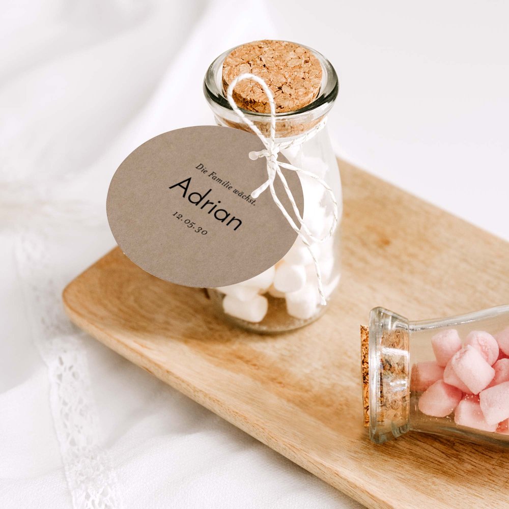 Die hübschen runden Anhänger eignen sich hervorragend, um kleine Präsente, Geschenkboxen und andere Aufmerksamkeiten zu personalisieren.
