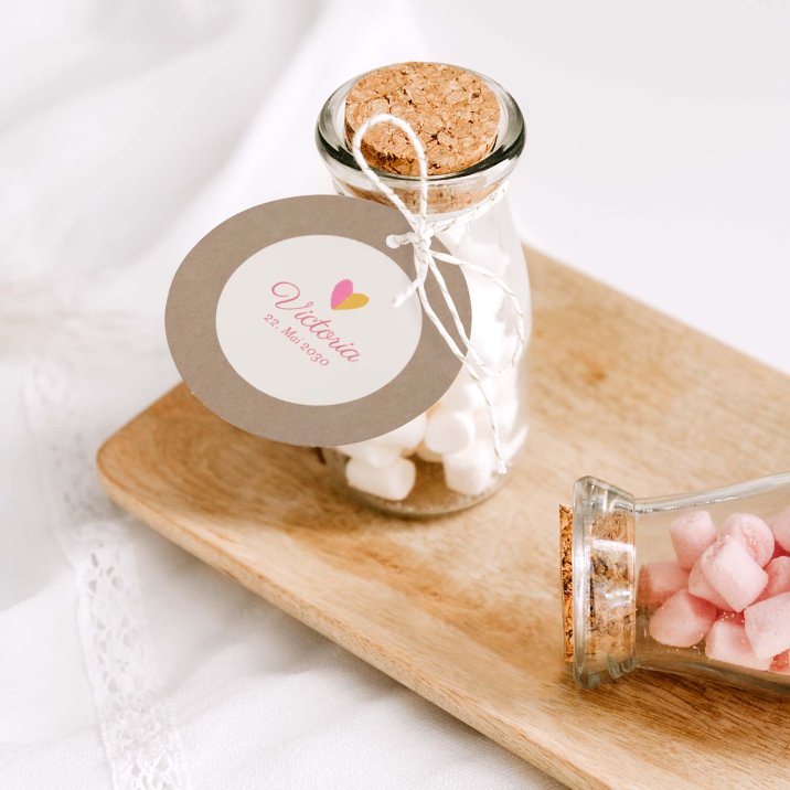 Die hübschen runden Anhänger eignen sich hervorragend, um kleine Präsente, Geschenkboxen und andere Aufmerksamkeiten zu personalisieren.