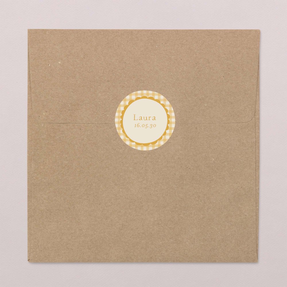 Bekleben Sie die Briefumschläge der Einladungskarten, Danksagungen oder kleine Geschenke mit diesen süßen Stickern. Die Aufkleber lassen sich in wenigen Handgriffen mit dem Namen und Geburtsdatum Ihres Kindes gestalten.