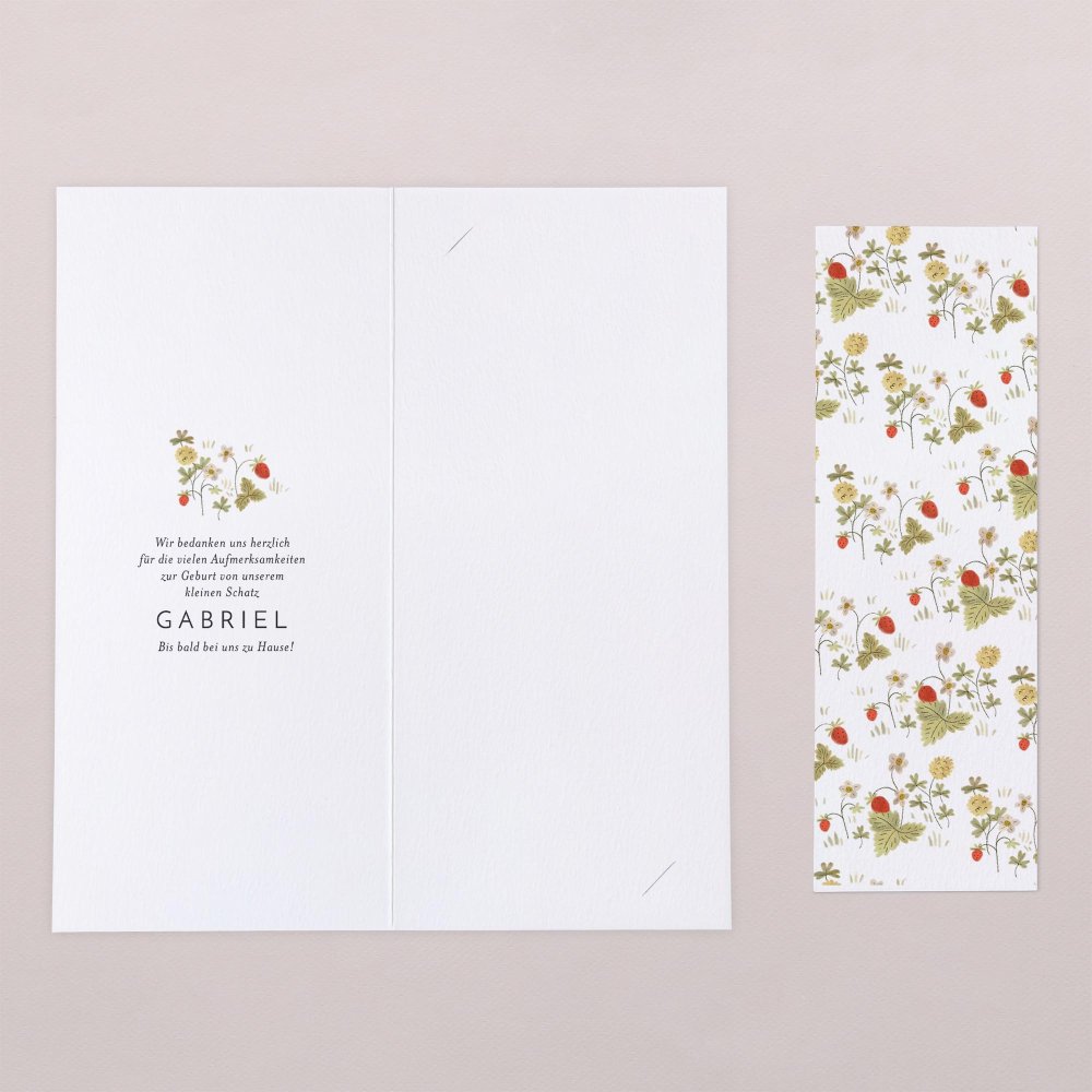 Diese Danksagung hat es in sich: die Klappkarte im Hochformat beinhaltet einen Fotostreifen mit Platz für 3 Ihrer schönsten Babyfotos.