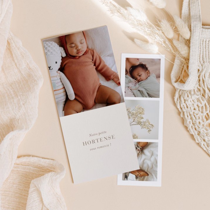 Diese Danksagung hat es in sich: die Klappkarte im Hochformat beinhaltet einen Fotostreifen mit Platz für 3 Ihrer schönsten Babyfotos.