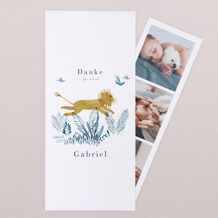 Diese Danksagung hat es in sich: die Klappkarte im Hochformat beinhaltet einen Fotostreifen mit Platz für 3 Ihrer schönsten Babyfotos.