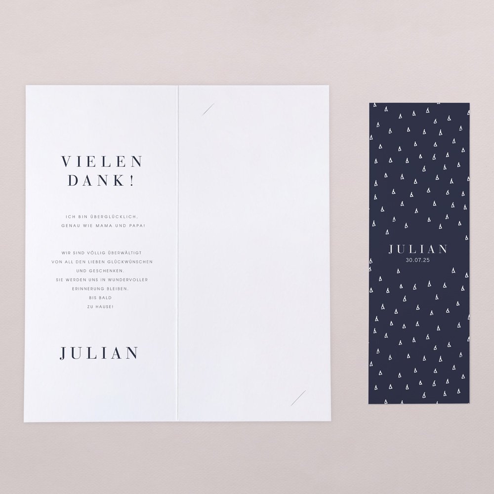 Diese Danksagung hat es in sich: die Klappkarte im Hochformat beinhaltet einen Fotostreifen mit Platz für 3 Ihrer schönsten Babyfotos.