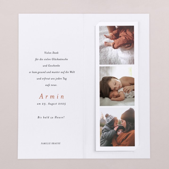 Diese Danksagung hat es in sich: die Klappkarte im Hochformat beinhaltet einen Fotostreifen mit Platz für 3 Ihrer schönsten Babyfotos.