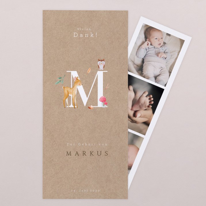Diese Danksagung hat es in sich: die Klappkarte im Hochformat beinhaltet einen Fotostreifen mit Platz für 3 Ihrer schönsten Babyfotos.