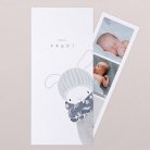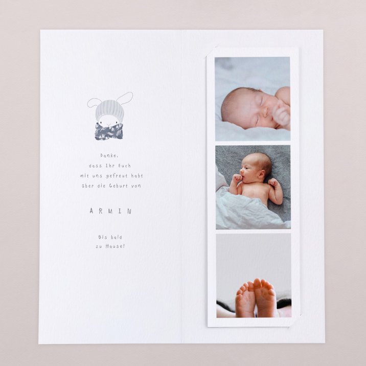 Diese Danksagung hat es in sich: die Klappkarte im Hochformat beinhaltet einen Fotostreifen mit Platz für 3 Ihrer schönsten Babyfotos.