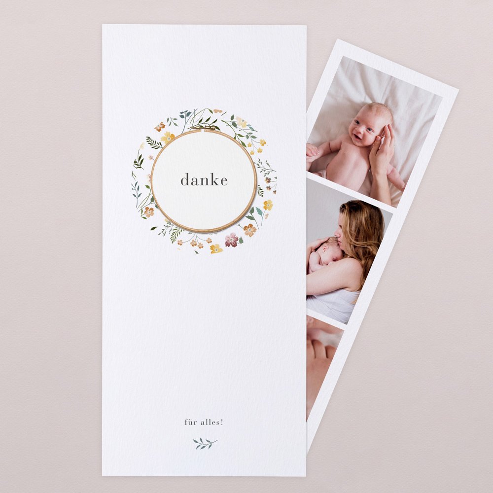 Diese Danksagung hat es in sich: die Klappkarte im Hochformat beinhaltet einen Fotostreifen mit Platz für 3 Ihrer schönsten Babyfotos.