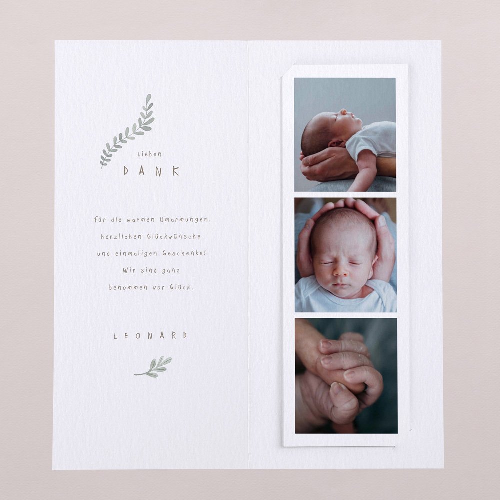 Diese Danksagung hat es in sich: die Klappkarte im Hochformat beinhaltet einen Fotostreifen mit Platz für 3 Ihrer schönsten Babyfotos.