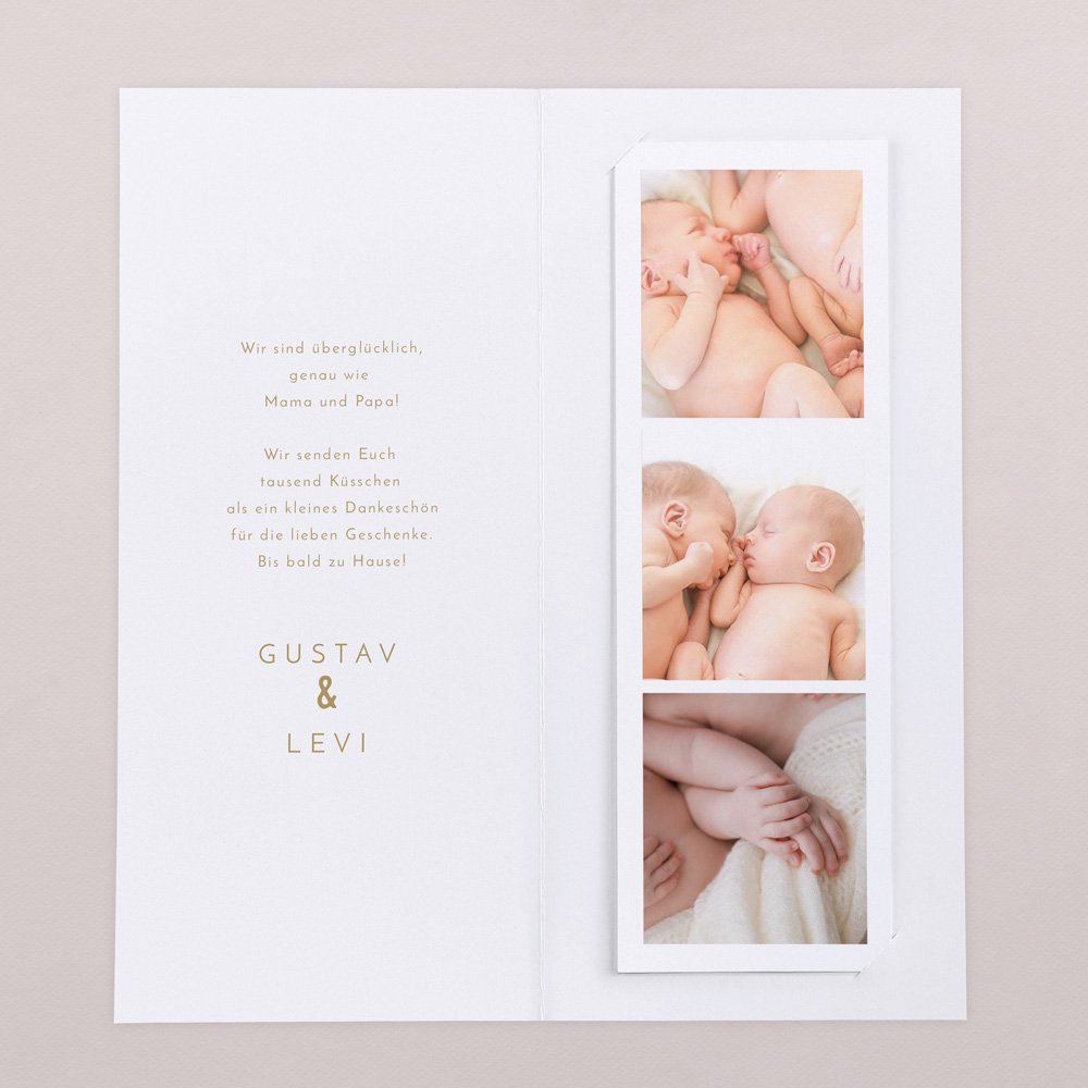 Diese Danksagung hat es in sich: die Klappkarte im Hochformat beinhaltet einen Fotostreifen mit Platz für 3 Ihrer schönsten Babyfotos.