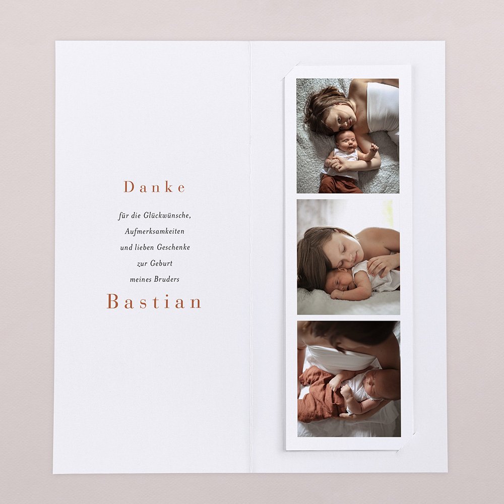 Diese Danksagung hat es in sich: die Klappkarte im Hochformat beinhaltet einen Fotostreifen mit Platz für 3 Ihrer schönsten Babyfotos.