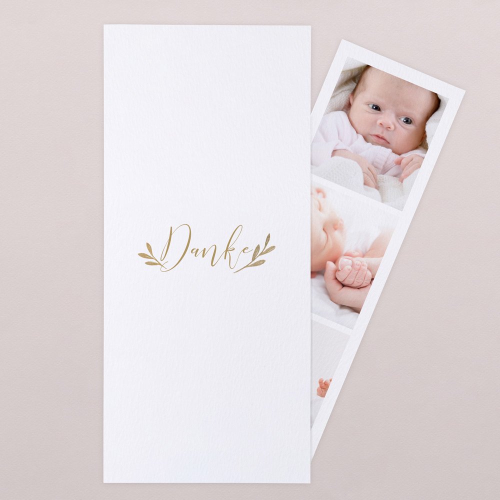 Diese Danksagung hat es in sich: die Klappkarte im Hochformat beinhaltet einen Fotostreifen mit Platz für 3 Ihrer schönsten Babyfotos.