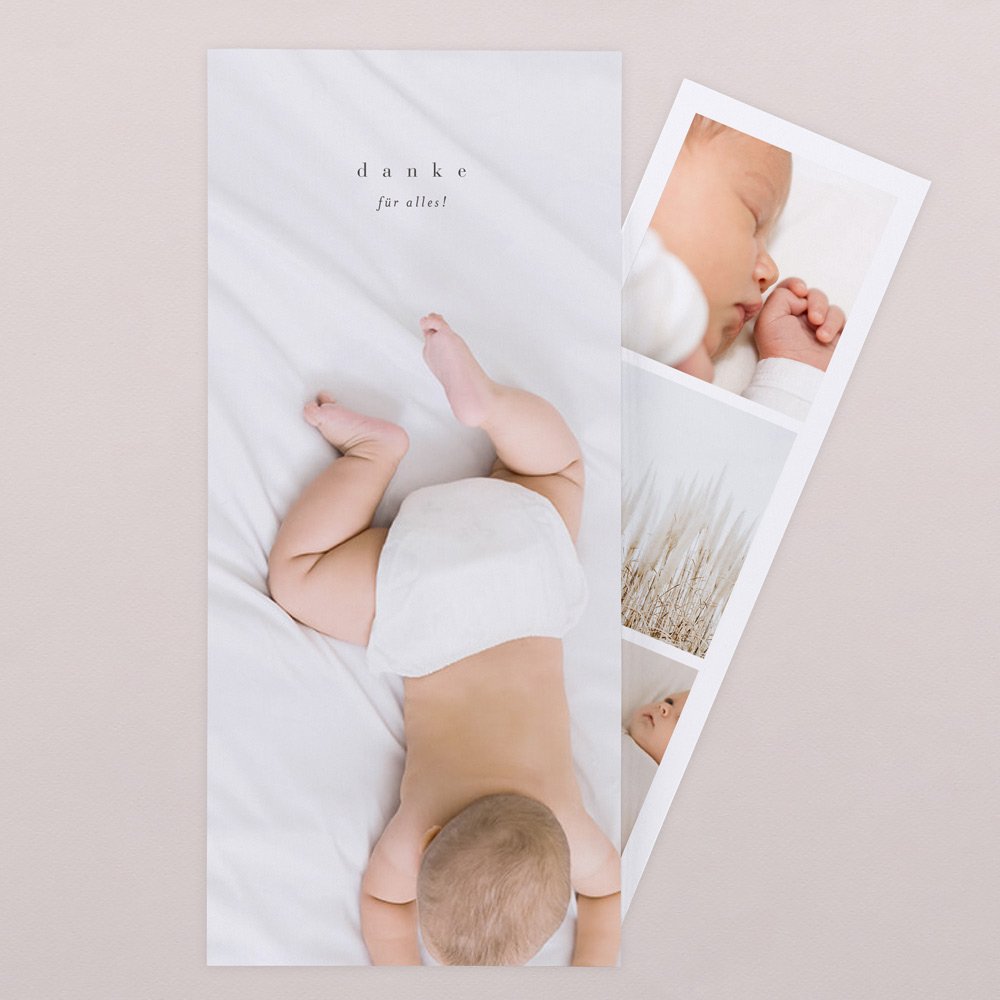 Diese Danksagung hat es in sich: die Klappkarte im Hochformat beinhaltet einen Fotostreifen mit Platz für 3 Ihrer schönsten Babyfotos.