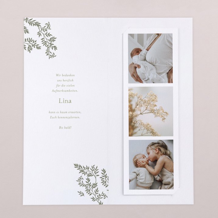 Diese Danksagung hat es in sich: die Klappkarte im Hochformat beinhaltet einen Fotostreifen mit Platz für 3 Ihrer schönsten Babyfotos.
