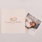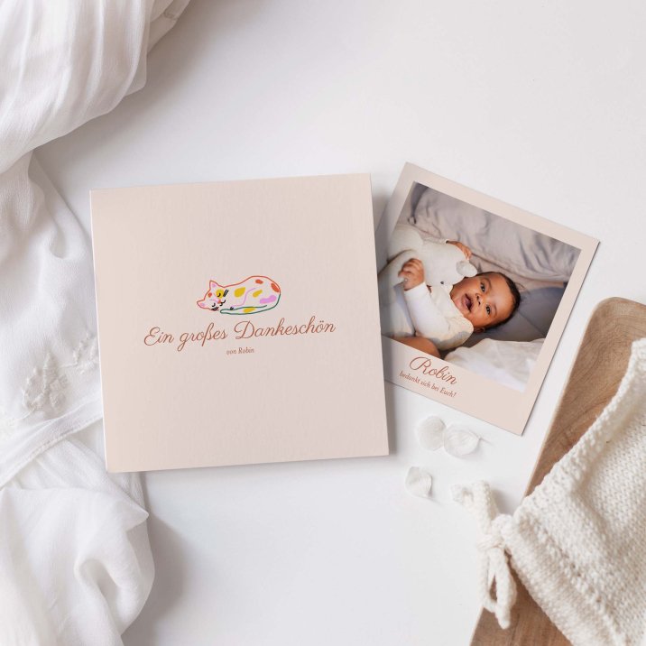 Bedanken Sie sich bei Ihren Lieben, die Sie anlässlich der Geburt Ihres Babys mit Aufmerksamkeiten überrascht und verwöhnt haben, mit einer hübschen persönlichen Karte. Diese Dankeskarte wird von einem Geschenk begleitet, das in die Karte gelegt wird: ein Foto Ihres Neugeborenen im Polaroid-Format (nicht magnetisch), das sie als Andenken aufbewahren, nach Lust und Laune aufhängen oder als Lesezeichen verwenden können...