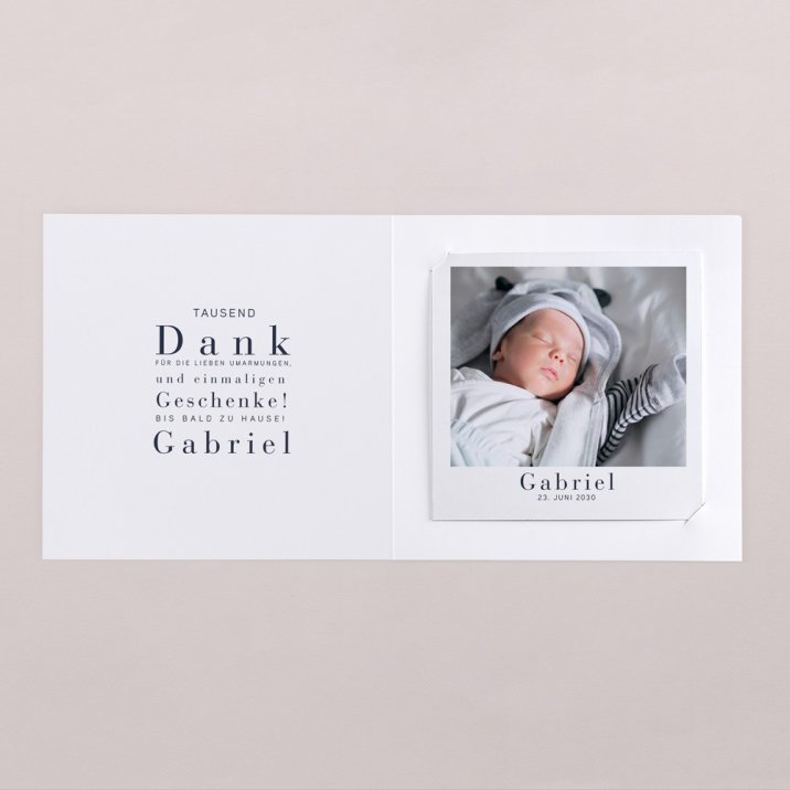 Bedanken Sie sich bei Ihren Lieben, die Sie anlässlich der Geburt Ihres Babys mit Aufmerksamkeiten überrascht und verwöhnt haben, mit einer hübschen persönlichen Karte. Diese Dankeskarte wird von einem Geschenk begleitet, das in die Karte gelegt wird: ein Foto Ihres Neugeborenen im Polaroid-Format (nicht magnetisch), das sie als Andenken aufbewahren, nach Lust und Laune aufhängen oder als Lesezeichen verwenden können...