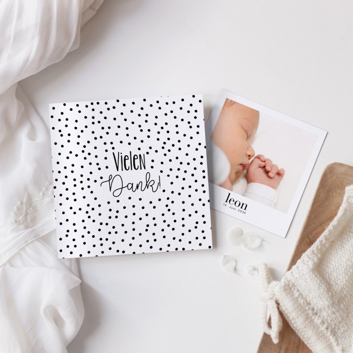 Bedanken Sie sich bei Ihren Lieben, die Sie anlässlich der Geburt Ihres Babys mit Aufmerksamkeiten überrascht und verwöhnt haben, mit einer hübschen persönlichen Karte. Diese Dankeskarte wird von einem Geschenk begleitet, das in die Karte gelegt wird: ein Foto Ihres Neugeborenen im Polaroid-Format (nicht magnetisch), das sie als Andenken aufbewahren, nach Lust und Laune aufhängen oder als Lesezeichen verwenden können...