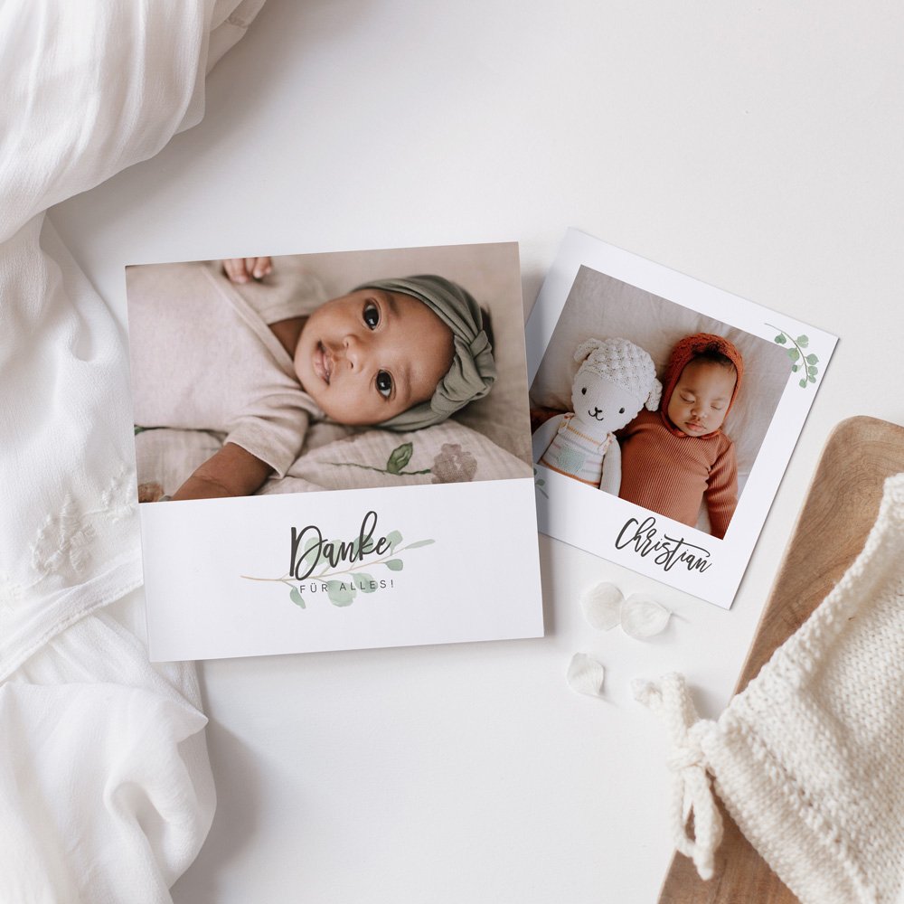 Bedanken Sie sich bei Ihren Lieben, die Sie anlässlich der Geburt Ihres Babys mit Aufmerksamkeiten überrascht und verwöhnt haben, mit einer hübschen persönlichen Karte. Diese Dankeskarte wird von einem Geschenk begleitet, das in die Karte gelegt wird: ein Foto Ihres Neugeborenen im Polaroid-Format (nicht magnetisch), das sie als Andenken aufbewahren, nach Lust und Laune aufhängen oder als Lesezeichen verwenden können...