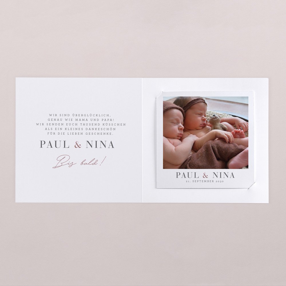 Bedanken Sie sich bei Ihren Lieben, die Sie anlässlich der Geburt Ihres Babys mit Aufmerksamkeiten überrascht und verwöhnt haben, mit einer hübschen persönlichen Karte. Diese Dankeskarte wird von einem Geschenk begleitet, das in die Karte gelegt wird: ein Foto Ihres Neugeborenen im Polaroid-Format (nicht magnetisch), das sie als Andenken aufbewahren, nach Lust und Laune aufhängen oder als Lesezeichen verwenden können...