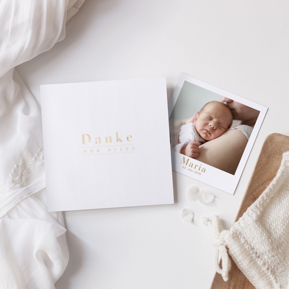 Bedanken Sie sich bei Ihren Lieben, die Sie anlässlich der Geburt Ihres Babys mit Aufmerksamkeiten überrascht und verwöhnt haben, mit einer hübschen persönlichen Karte. Diese Dankeskarte wird von einem Geschenk begleitet, das in die Karte gelegt wird: ein Foto Ihres Neugeborenen im Polaroid-Format (nicht magnetisch), das sie als Andenken aufbewahren, nach Lust und Laune aufhängen oder als Lesezeichen verwenden können...