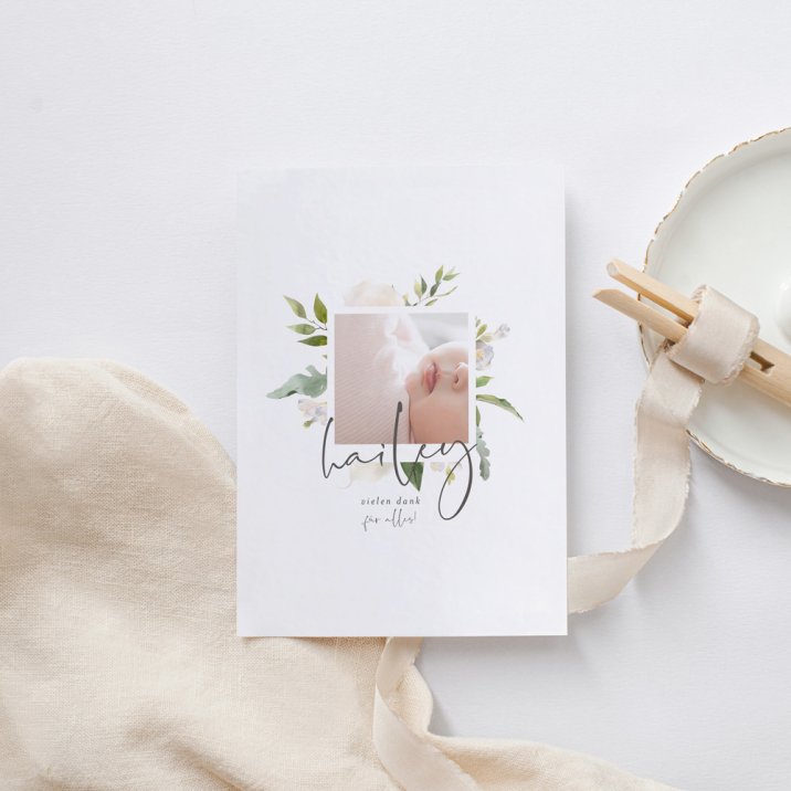 Wählen Sie Ihre Danksagung entweder passend zu Ihrer Geburtskarte oder versenden Sie ein anderes Design, das Ihnen gefällt. Gestalten Sie die Karte mit einem süßen Foto von Ihrem Baby und herzlichen Dankesworten, um so auf stilvolle Art und Weise "Danke" zu sagen.