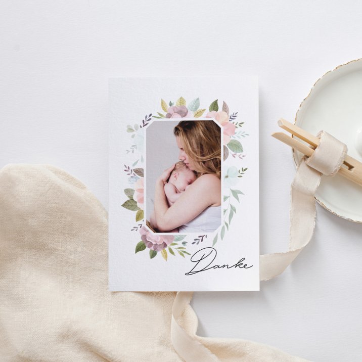Wählen Sie Ihre Danksagung entweder passend zu Ihrer Geburtskarte oder versenden Sie ein anderes Design, das Ihnen gefällt. Gestalten Sie die Karte mit einem süßen Foto von Ihrem Baby und herzlichen Dankesworten, um so auf stilvolle Art und Weise "Danke" zu sagen.