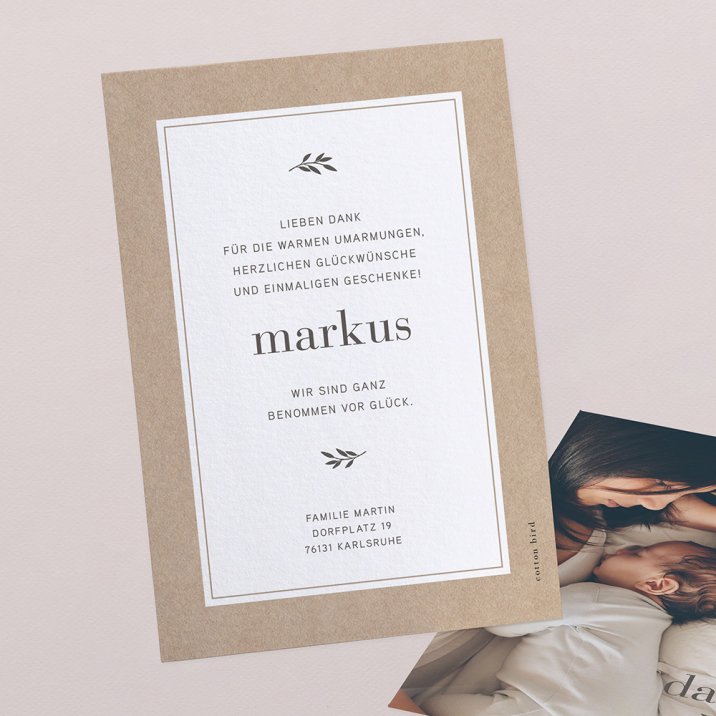 Wählen Sie Ihre Danksagung entweder passend zu Ihrer Geburtskarte oder versenden Sie ein anderes Design, das Ihnen gefällt. Gestalten Sie die Karte mit einem süßen Foto von Ihrem Baby und herzlichen Dankesworten, um so auf stilvolle Art und Weise "Danke" zu sagen.