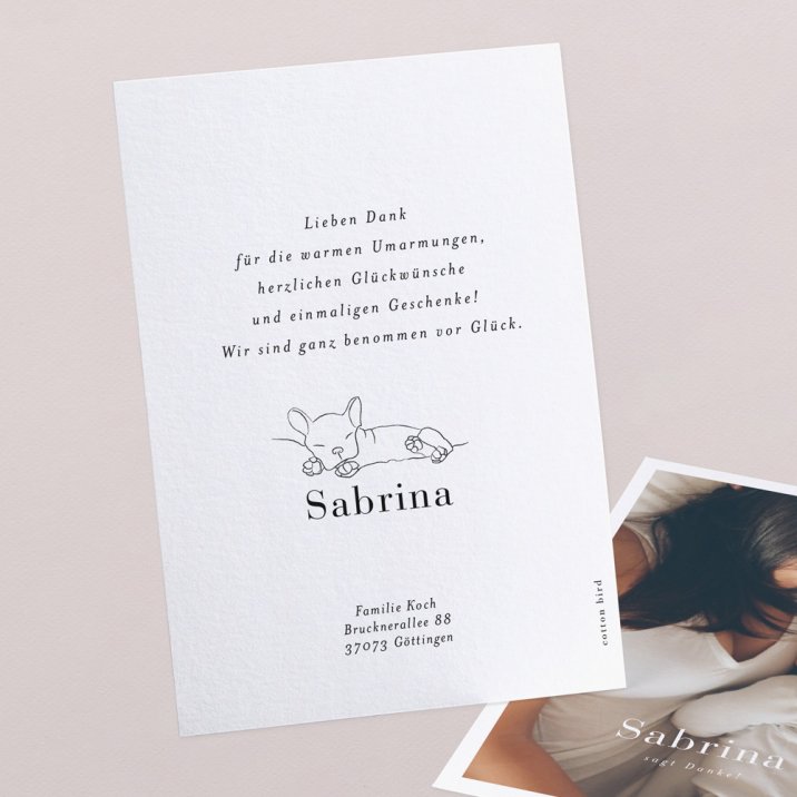 Wählen Sie Ihre Danksagung entweder passend zu Ihrer Geburtskarte oder versenden Sie ein anderes Design, das Ihnen gefällt. Gestalten Sie die Karte mit einem süßen Foto von Ihrem Baby und herzlichen Dankesworten, um so auf stilvolle Art und Weise "Danke" zu sagen.
