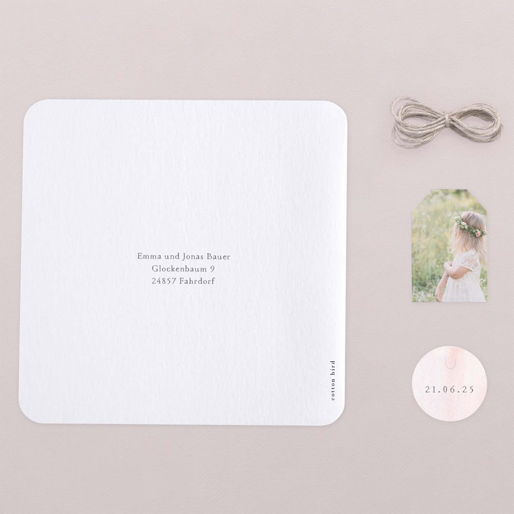 Diese Einladungskarte hat die Form einer quadratischen Karte, die in der Mitte gefaltet ist. Ihre Ecken sind abgerundet, für eine sanftere Optik.