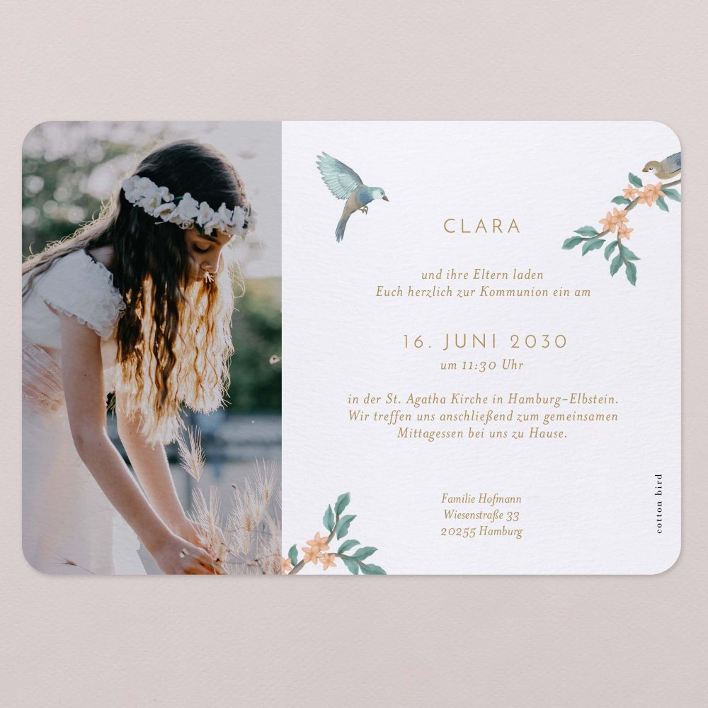 Blüten verkünden den Frühling, einen neuen Beginn des Wachsens und Blühens, in Begleitung von zart illustrierten Vögeln. Diese poetische Szene kündigt ein besonderes Ereignis im Leben Ihres Kindes an. Laden Sie Familie und Freunde mit der Kommunionskarte Finken zu diesem freudigen Anlass ein.