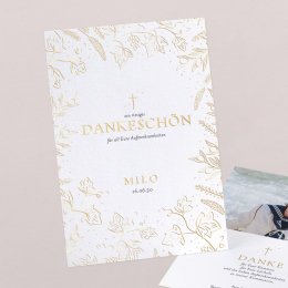Weinranken, Olivenzweige und Weizenähren schmücken die elegante Kommunionseinladung Eucharistie. Das zarte Design ist mit Gold veredelt und wird Ihre Gäste sicher begeistern.