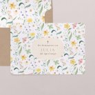 Frisch und frühlingshaft präsentiert sich die Einladungskarte Lilly Rose mit Narzissen, Veilchen, Löwenzahn und weiteren bunten Blumen. Verziert mit kleinen Bienen ist diese Karte die perfekte Wahl für eine Kommunion im Frühling oder Sommer.