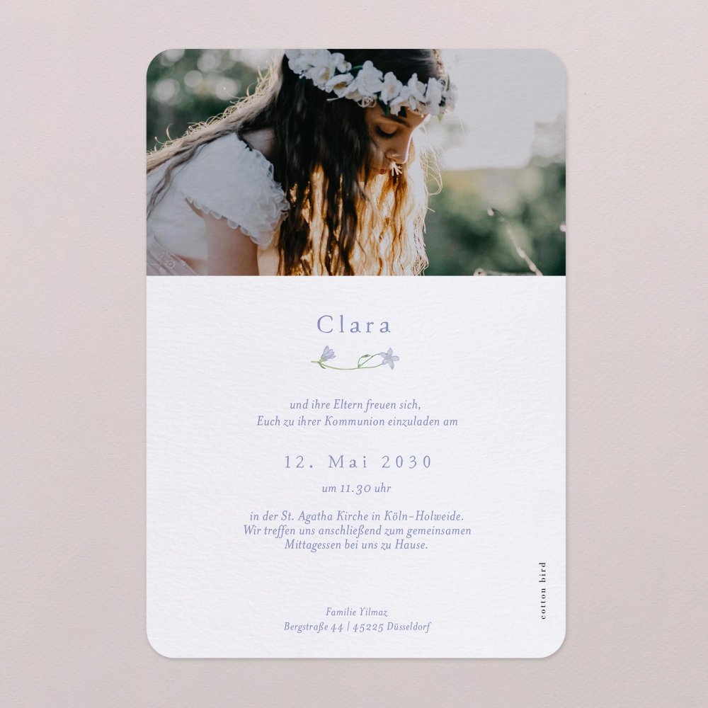 Die Kommunionkarte Violetta ist mit einem zarten Blumenkranz aus feinen Violetten Blüten illustriert. Das poetische Design der Einladungskarte wirkt elegant und passt perfekt zu einer liebevollen Kommunionsfeier im Frühling.