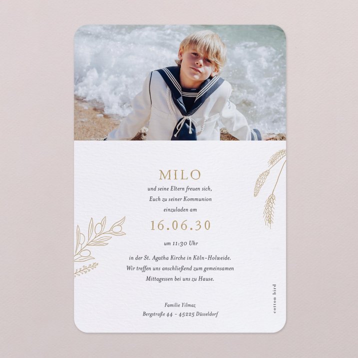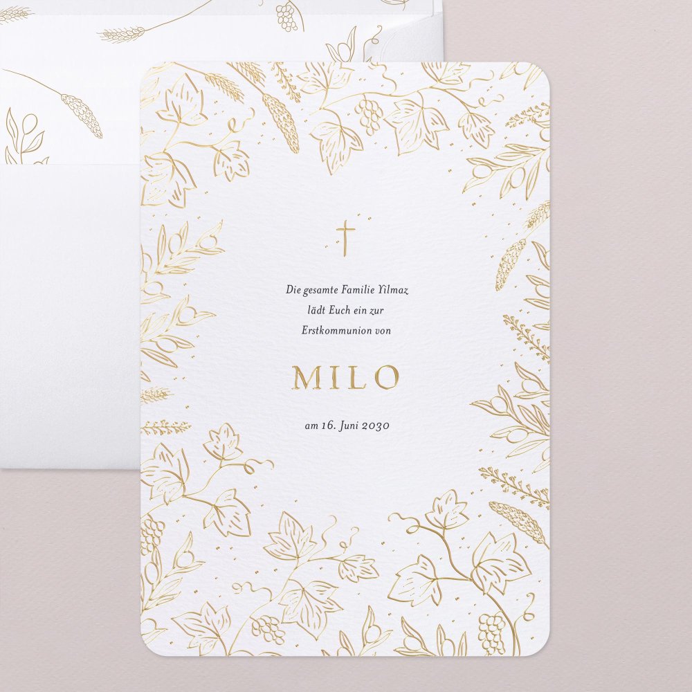 Weinranken, Olivenzweige und Weizenähren schmücken die elegante Kommunionseinladung Eucharistie. Das zarte Design ist mit Gold veredelt und wird Ihre Gäste sicher begeistern.