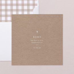 Der elegante Kraftpapierhintergrund der Einladungskarte Glückwunsch ist mit einem schlichten weißen Kreuz verziert, das die bevorstehende Kommunionsfeier symbolisiert. Die Karte kann mit einem schönen Foto von Ihrem Kind gestaltet werden, so dass die Einladung noch persönlicher wird.