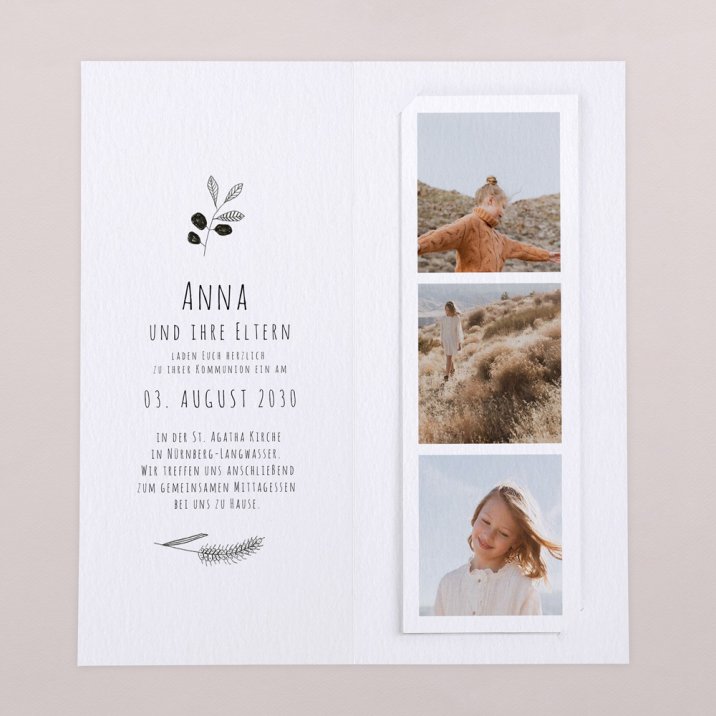 Das besondere Format dieser Einladungskarte wird Ihre Liebsten begeistern! Dieses Modell besteht aus einer hochformatigen Klappkarte und einem herausnehmbaren Fotostreifen, der als Andenken aufbewahrt werden kann, an den Kühlschrank gepinnt oder als Lesezeichen benutzt werden kann.