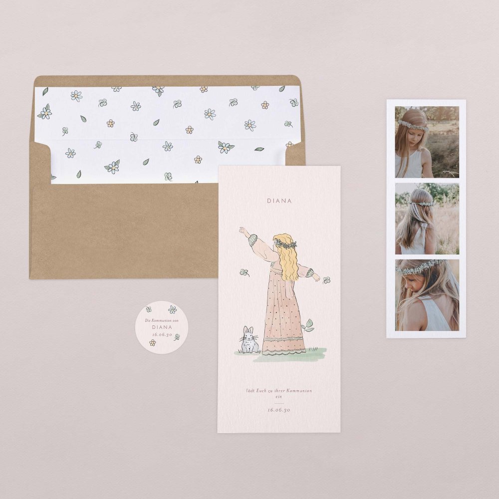 Eine fröhliche Szene in der Natur ziert die Einladungskarte Hosanna. In Pastelltönen illustriert und mit einem hübschen Blumenkranz im Haar, freut sich das Mädchen auf der Karte auf ihre Heilige Erstkommunion.