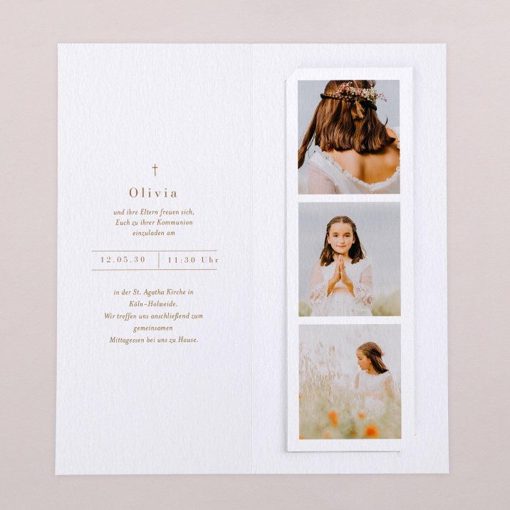 Das besondere Format dieser Einladungskarte wird Ihre Liebsten begeistern! Dieses Modell besteht aus einer hochformatigen Klappkarte und einem herausnehmbaren Fotostreifen, der als Andenken aufbewahrt werden kann, an den Kühlschrank gepinnt oder als Lesezeichen benutzt werden kann.