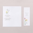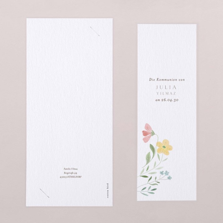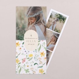Frisch und frühlingshaft präsentiert sich die Einladungskarte Lilly Rose mit Narzissen, Veilchen, Löwenzahn und weiteren bunten Blumen. Verziert mit kleinen Bienen ist diese Karte die perfekte Wahl für eine Kommunion im Frühling oder Sommer.