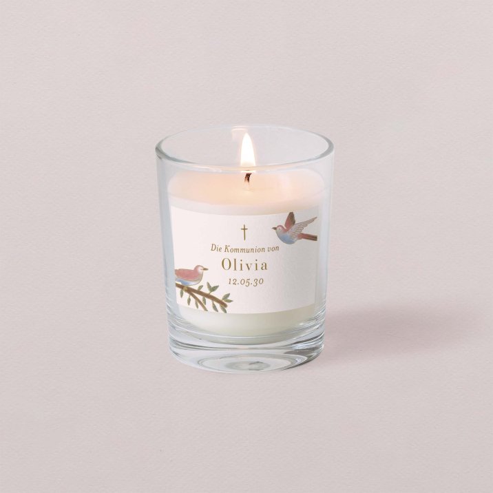 Schenken Sie Ihren Gästen eine schöne Erinnerung an die Kommunion Ihres Kindes. Die kleine personalisierte Kerze mit zartem Feigenduft wird Ihre Liebsten noch lange an die gemeinsamen Momente dieses Tages erinnern.