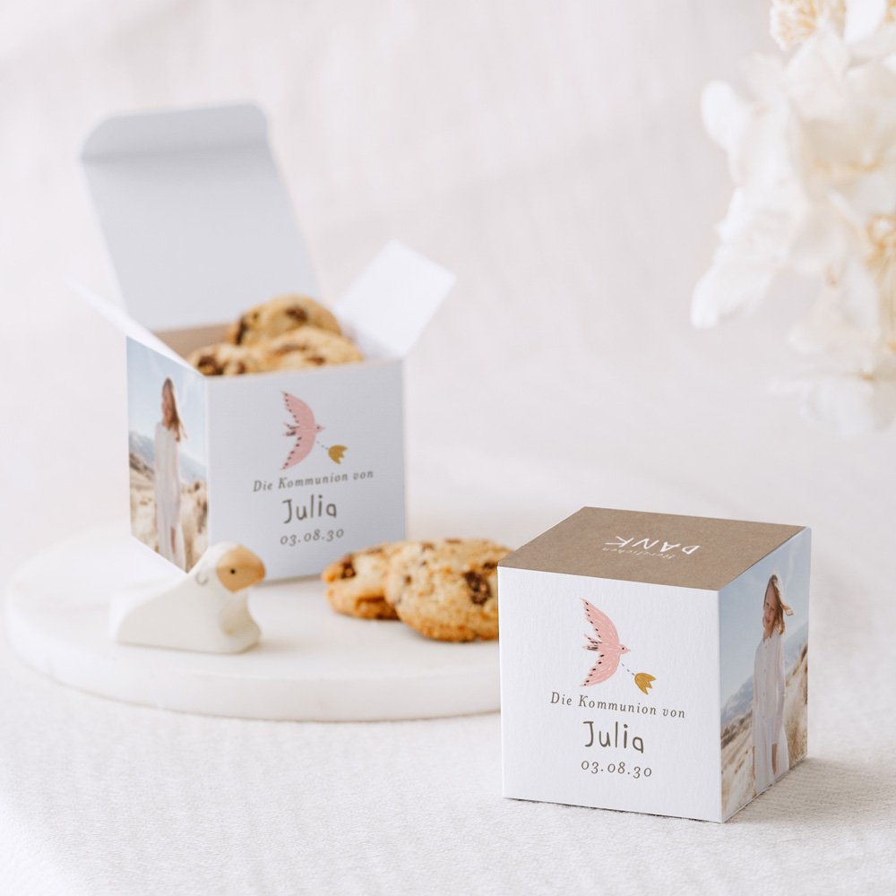 Überraschen Sie die Kommunionsgäste mit einer kleinen Geschenkbox, die Sie mit Süßigkeiten, Keksen, Gummibärchen oder einem kleinen Geschenk füllen.