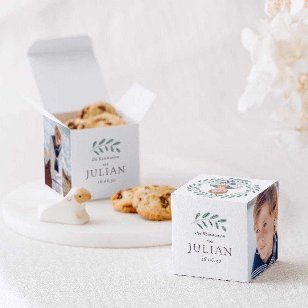 Gestalten Sie die Box mit dem Namen des Kindes, dem Datum der Kommunion und einer kleinen Nachricht und sorgen Sie für Freude bei Ihren Liebsten.