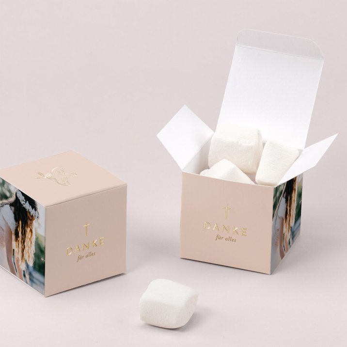 Gestalten Sie die Box mit dem Namen des Kindes, dem Datum der Kommunion und einer kleinen Nachricht und sorgen Sie für Freude bei Ihren Liebsten.