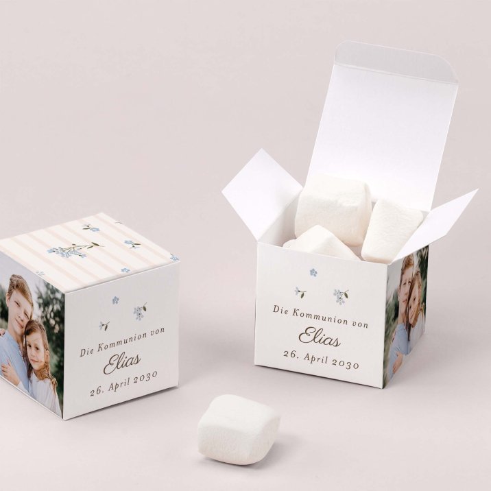 Gestalten Sie die Box mit dem Namen des Kindes, dem Datum der Kommunion und einer kleinen Nachricht und sorgen Sie für Freude bei Ihren Liebsten.